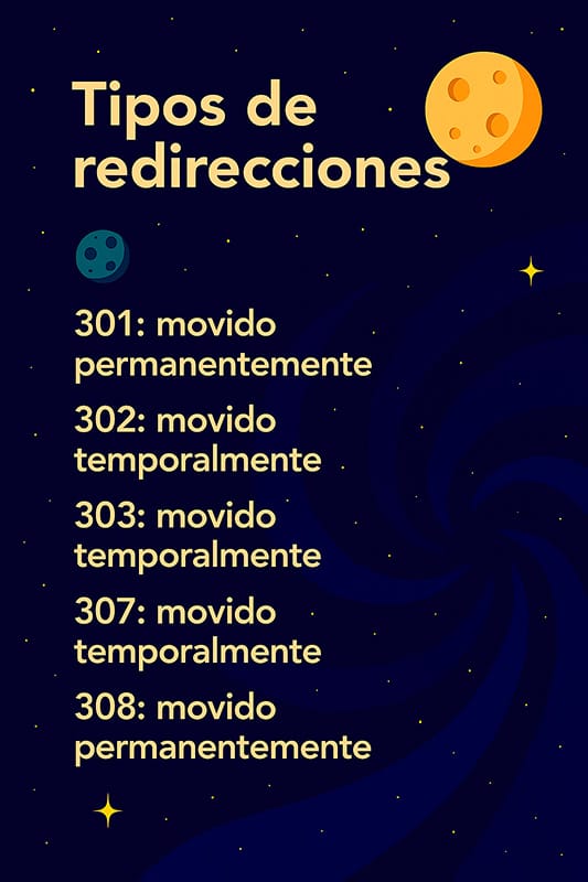 ¿Y qué pasa con esos números que tanto se mencionan cuando se habla de redirecciones?: sirven para indicar a los buscadores y navegadores qué tipo de redirección se va a hacer, aunque realmente a ti te da igual porque ya lo automatizan los plugins y aplicaciones que vamos a usar un poco más abajo, simplemente saber qué significa cada uno y qué le estamos indicando a Google como veremos a continuación.